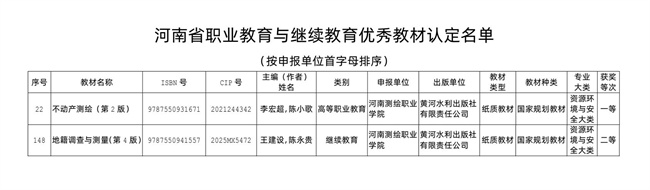 近日,河南省教育厅公布2025年教材等级评定结果,河南测绘职业学院推荐的两本教材双双获奖。其中,《不动产测绘(第二版)》荣获职业教育与继续教育类一等奖,《地籍调查与测量(第四版)》荣获二等奖。